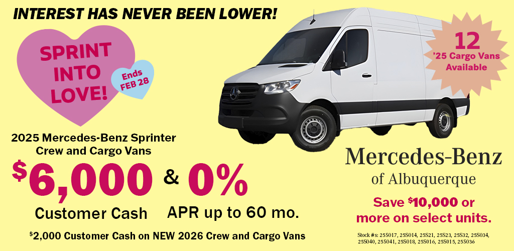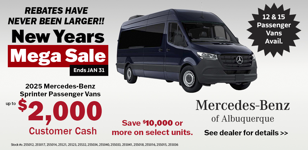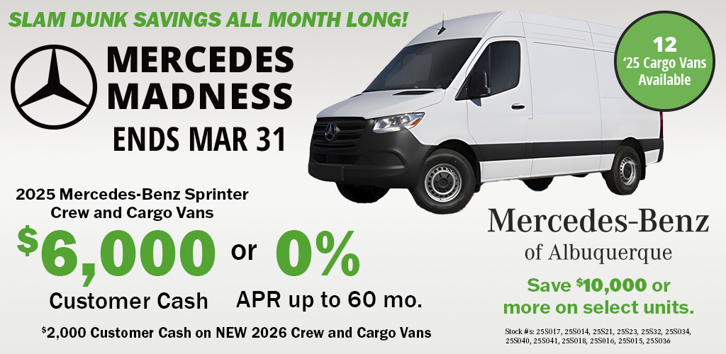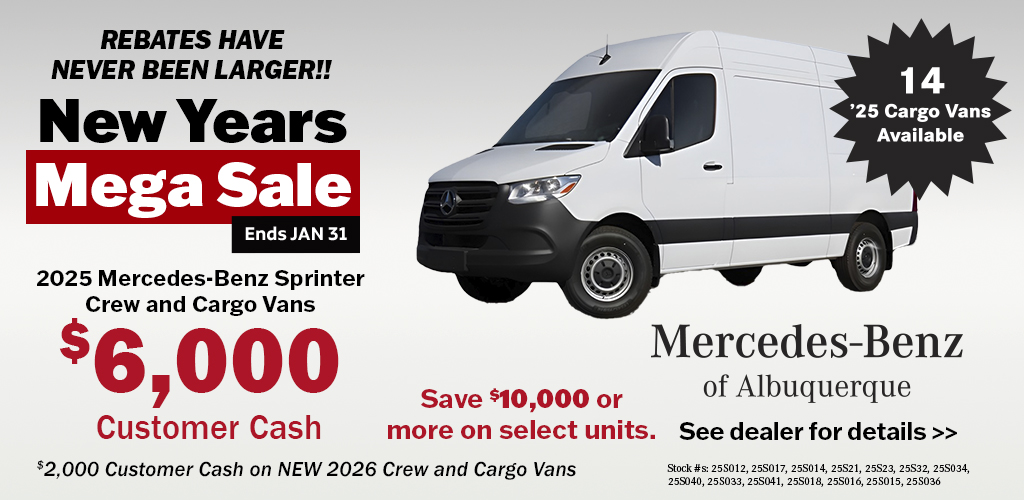 Mercedes-Benz of Albuquerque is your trusted local dealership for Mercedes-Benz Sprinter Vans. With the largest selection in New Mexico, we are committed to providing you with the best options for Cargo, Passenger, Crew, and Cab Chassis/Cutaway Vans.